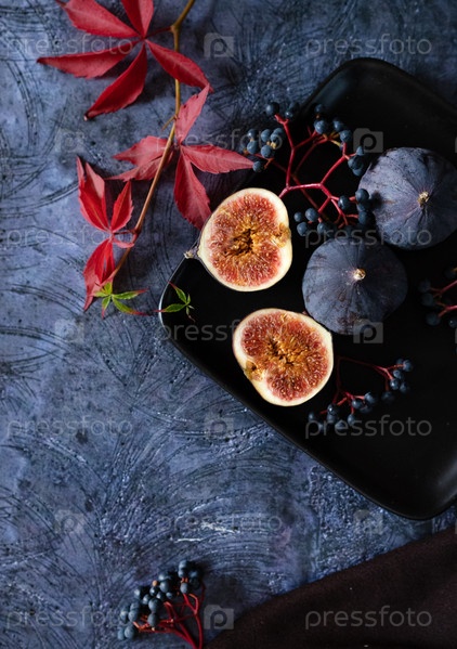 Спелый инжир с красными виноградными листьями. Осенний натюрморт. Темный фон