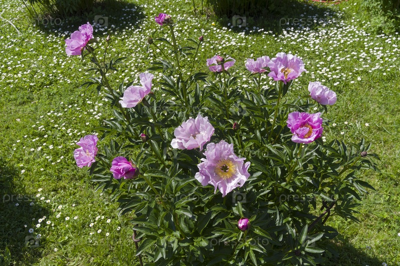 Цветущий пион сорта "Новость Алтая". Ботанический сад Московского университета. Солнечный день в конце мая