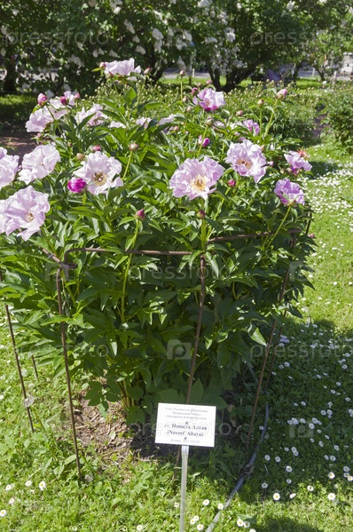 Цветущий пион сорта "Новость Алтая". Ботанический сад Московского университета. Солнечный день в конце мая
