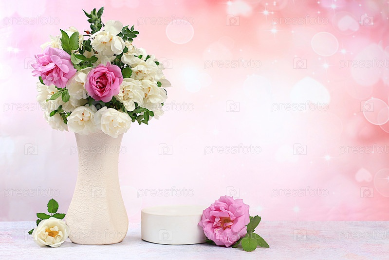 Красивые весенние цветущие ветви шиповника и роз в вазе на солнечном фоне, баннер. Абстрактная цветочная композиция с пустым подиумом для демонстрации продукта, шаблон для демонстрации, натюрморт с местом для текста,