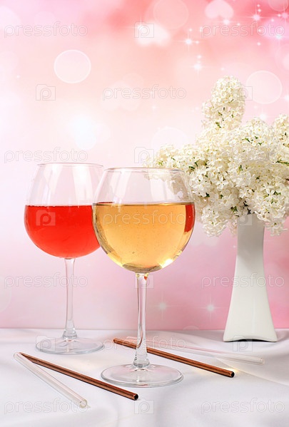 Праздничный алкогольный коктейль, красное и белое вино в бокалах на ярком фоне с букетом белой сирени, концепция летнего бара, алкогольные напитки на вечеринке, реклама ресторана и кафе, избирательный фокус