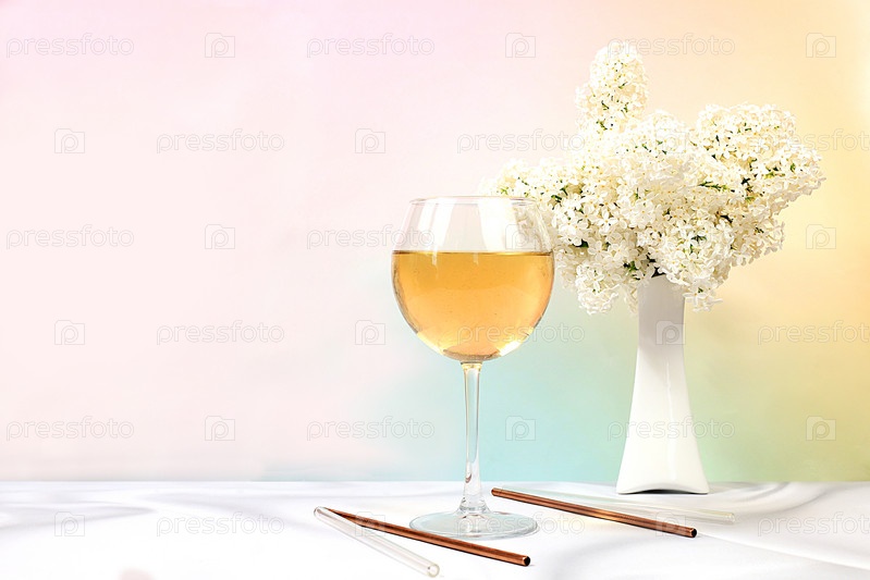Праздничный алкогольный коктейль, белое вино в бокале на ярком фоне с букетом белой сирени, концепция летнего бара, алкогольные напитки на вечеринке, реклама ресторана и кафе, избирательный фокус