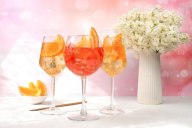 Праздничный алкогольный коктейль Aperol spritz в стаканах на ярком фоне с букетом сирен, концепция летнего бара, спиртные напитки на вечеринке, реклама ресторана и кафе, избирательный фокус