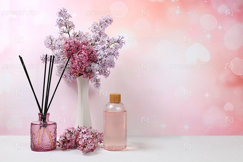 Ароматная розовая вода, сиреневые ароматические палочки и цветы сирени. Спа и оздоровительная композиция, приглашение и реклама салона, ароматерапия и уход за кожей, концепция образа жизни и органической косметики, избирательный фокус