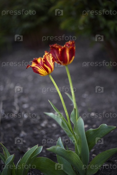 Красные и желтые тюльпаны в летнем саду. Желто-красные цветы