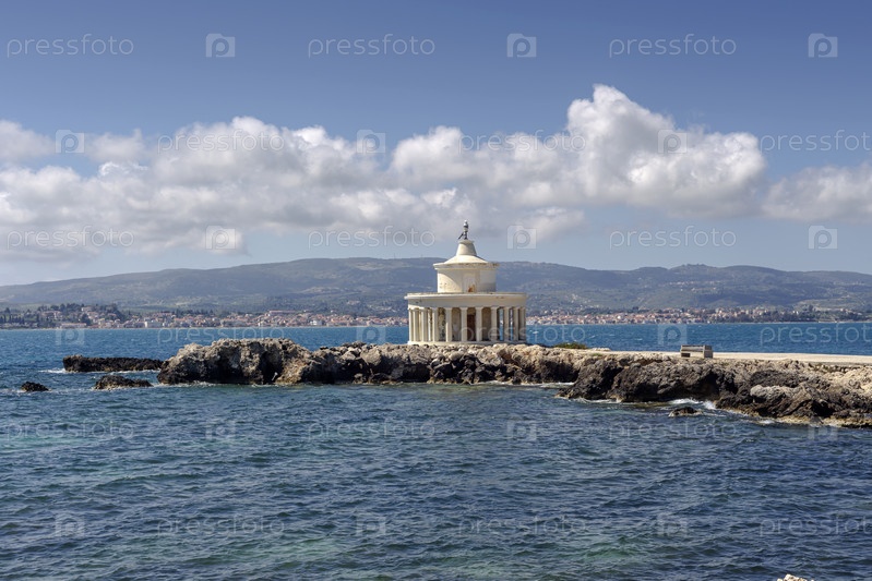 Старый каменный маяк (остров Кефалония, Греция) на фоне моря и гор