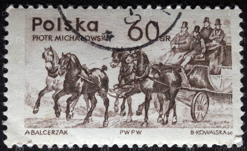Почтовая марка с гашением Польша 1965 год. Почтовая карета, автор Петр Михаловский
