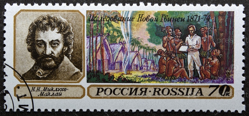 Почтовая марка с гашением Россия 1992 год. Исследование Новой Гвинеи (1871-1874). Николай Николаевич Миклухо-Маклай (1846-1912) - российский этнограф, биолог, антрополог, путешественник