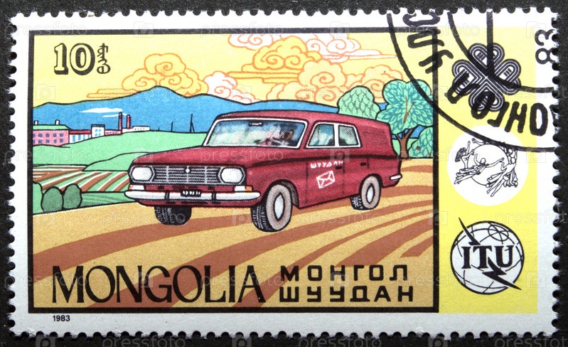 Почтовая марка с гашением Монголия 1983 год. Всемирный год связи. Почтовый автомобиль