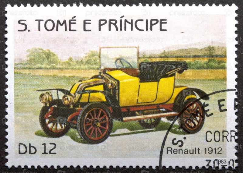 Почтовая марка с отметкой Сан-Томе и Принсипи 1983 г. Автомобиль Renault 1912