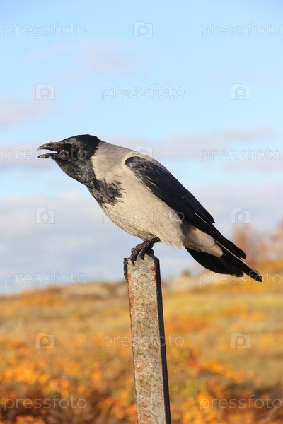 Ворона с расправленными крыльями сидит на столбике. Серый ворон