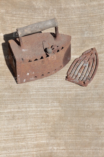 Редкий утюг, работающий на углях. Он стоит на грубой ткани. Утюг открыт, решетка расположена рядом