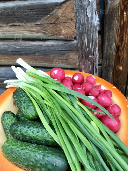 Овощи лежат на блюде. Свежие огурцы, сочный зеленый лук и красная редиска. На фоне деревянной стены старого сарая