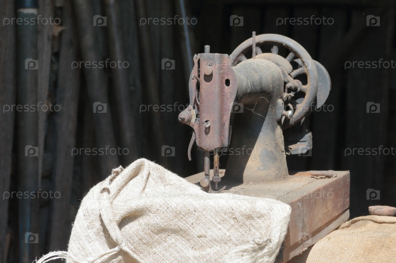 Старая швейная машинка с ручным приводом. Покрыт коррозией, пылью и паутиной. В него вшивается кусок грубой ткани