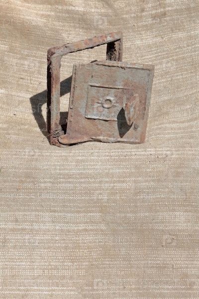 Старая чугунная дверца для печи. Он стоит на грубой ткани