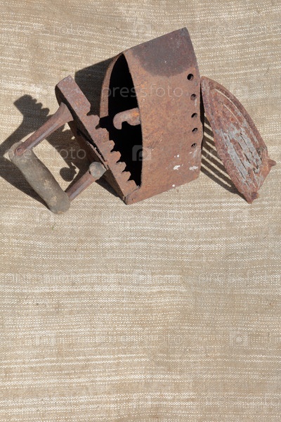 Редкий утюг, работающий на углях. Он стоит на грубой ткани. Утюг открыт, решетка расположена рядом