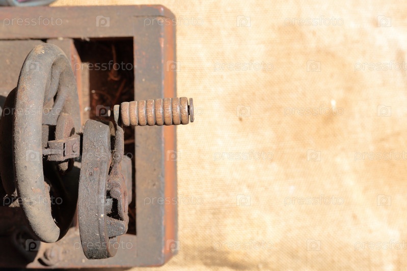 Старая швейная машинка с ручным приводом. Покрыт коррозией, пылью и паутиной. Он стоит на грубой ткани