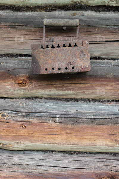 Редкий утюг, работающий на углях. Висит на гвозде, вбитом в стену старого деревянного сарая