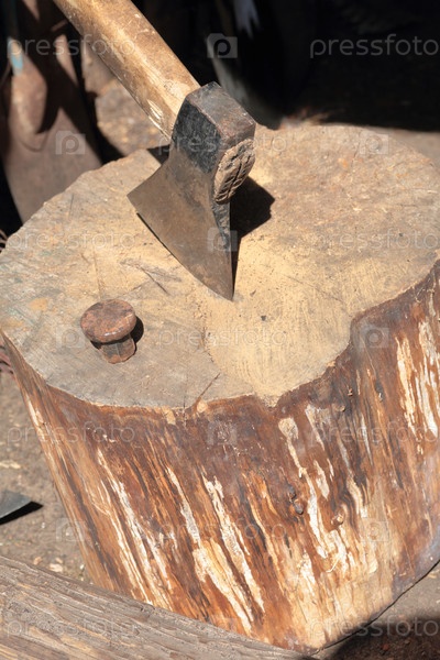 Топор вбит в деревянную колоду. Далее идет кованая наковальня для клепки косы