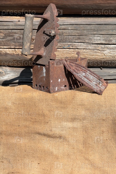 Редкий утюг, работающий на углях. Он стоит на фоне старого деревянного сарая. Он стоит на грубой ткани. Утюг открыт, решетка расположена рядом