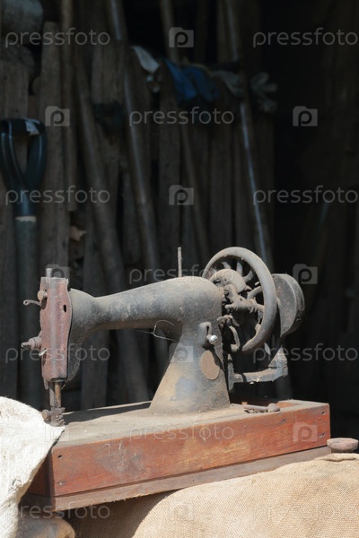 Старая швейная машинка с ручным приводом. Покрыт коррозией, пылью и паутиной. В него вшивается кусок грубой ткани