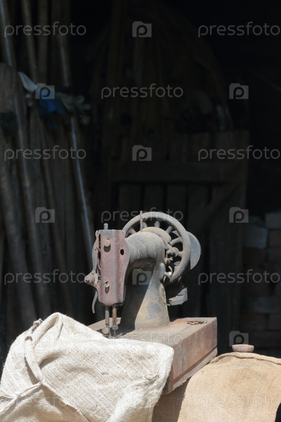 Старая швейная машинка с ручным приводом. Покрыт коррозией, пылью и паутиной. В него вшивается кусок грубой ткани