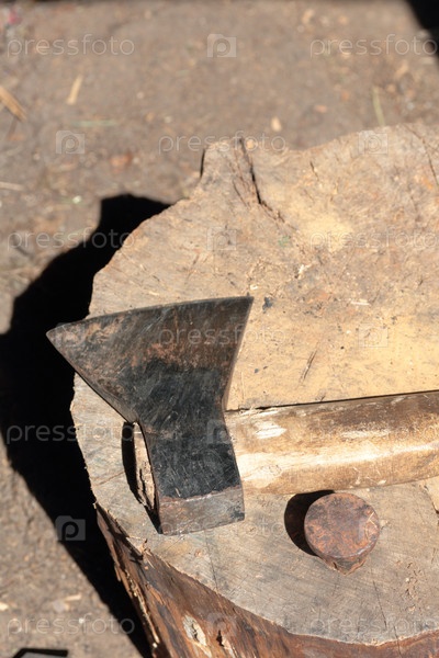 Топор лежит на деревянной палубе. Далее идет кованая наковальня для клепки косы