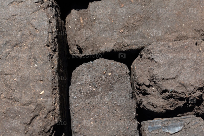 Рядом сложены торфяные брикеты. Крупный план. Вид сверху