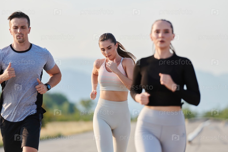 Группа друзей ведет здоровый образ жизни, бегая на свежем воздухе в солнечный день, занимаясь фитнесом и наслаждаясь бодрящим эффектом физических упражнений и природы