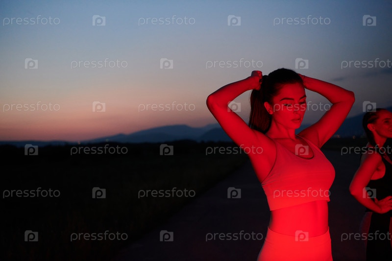 Спортсмен принимает позу в красном ночном сиянии
