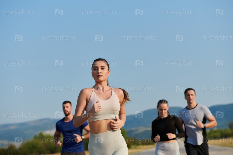 Группа друзей ведет здоровый образ жизни, бегая на свежем воздухе в солнечный день, занимаясь фитнесом и наслаждаясь бодрящим эффектом физических упражнений и природы