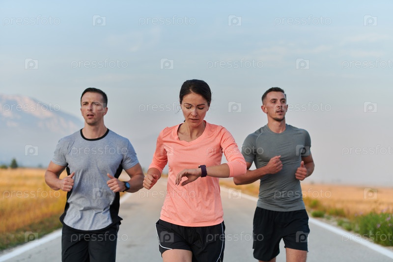 Группа друзей, спортсменов и любителей бега бегом ранним утром пробегает сквозь туманный рассвет, зарядившись энергией восходящего солнца и окруженная спокойной красотой природы