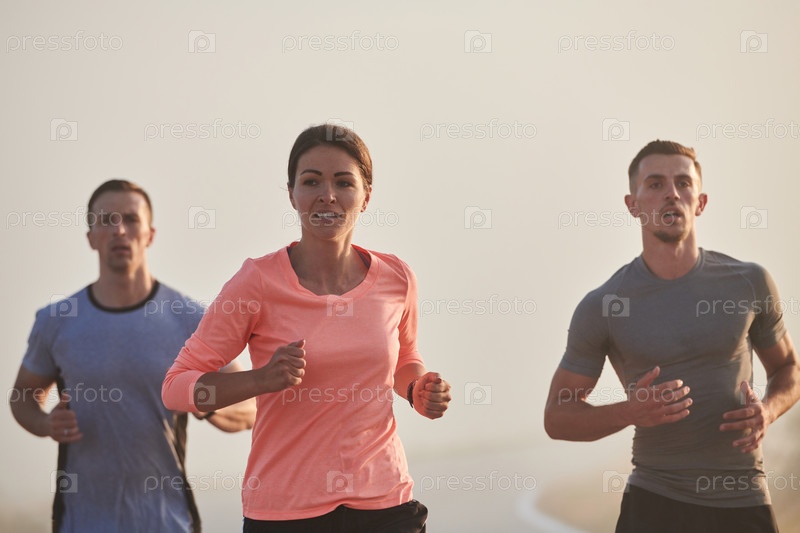 Группа друзей, спортсменов и любителей бега бегом ранним утром пробегает сквозь туманный рассвет, зарядившись энергией восходящего солнца и окруженная спокойной красотой природы