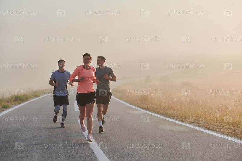 Группа друзей, спортсменов и любителей бега бегом ранним утром пробегает сквозь туманный рассвет, зарядившись энергией восходящего солнца и окруженная спокойной красотой природы