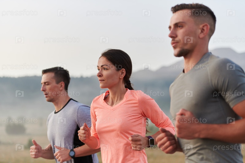 Группа друзей, спортсменов и любителей бега бегом ранним утром пробегает сквозь туманный рассвет, зарядившись энергией восходящего солнца и окруженная спокойной красотой природы