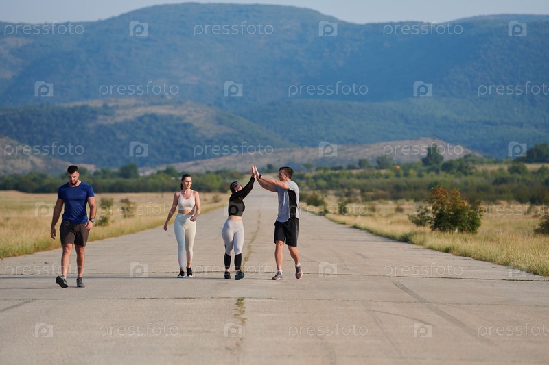Группа друзей ведет здоровый образ жизни, бегая на свежем воздухе в солнечный день, занимаясь фитнесом и наслаждаясь бодрящим эффектом физических упражнений и природы