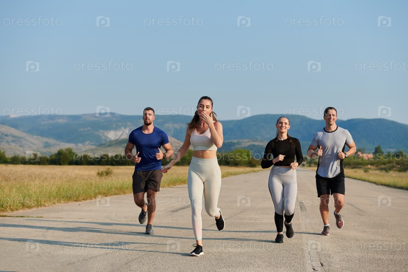 Группа друзей ведет здоровый образ жизни, бегая на свежем воздухе в солнечный день, занимаясь фитнесом и наслаждаясь бодрящим эффектом физических упражнений и природы