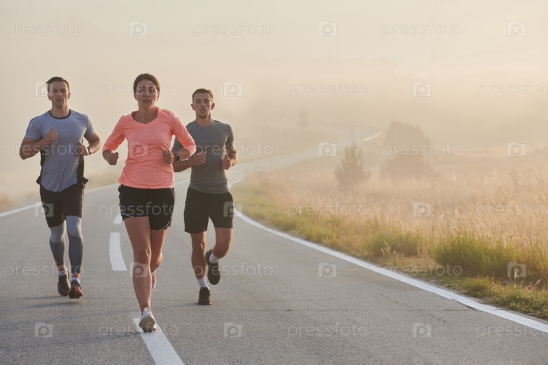 Группа друзей, спортсменов и любителей бега бегом ранним утром пробегает сквозь туманный рассвет, зарядившись энергией восходящего солнца и окруженная спокойной красотой природы