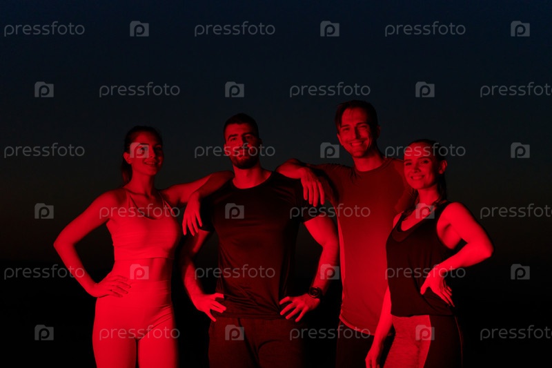 Разнообразные спортсмены расслабляются: отдых после марафона под красным ночным сиянием