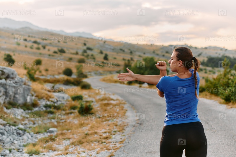 Решительная спортсменка растягивается после интенсивного бега по пересеченной горной местности