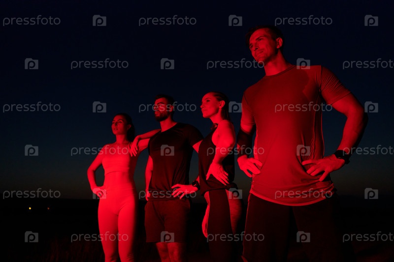 Разнообразные спортсмены расслабляются: отдых после марафона под красным ночным сиянием