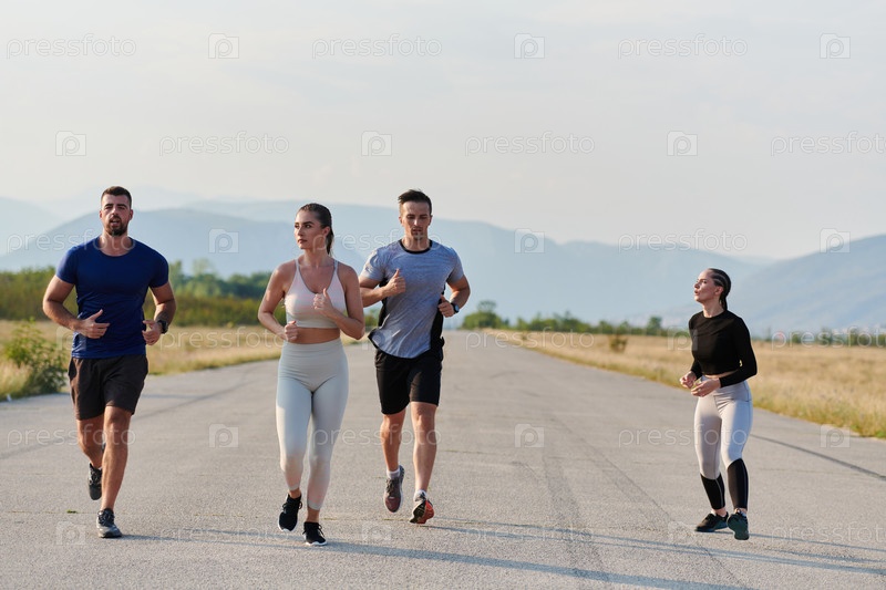 Группа друзей ведет здоровый образ жизни, бегая на свежем воздухе в солнечный день, занимаясь фитнесом и наслаждаясь бодрящим эффектом физических упражнений и природы