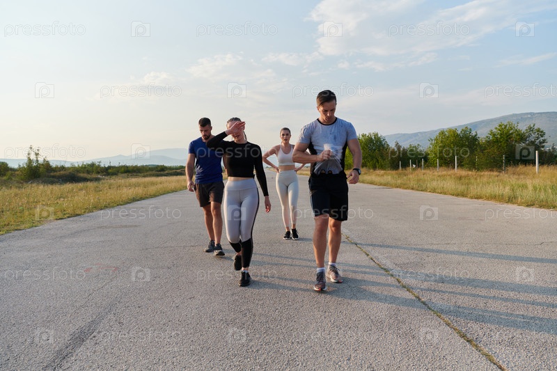 Группа друзей ведет здоровый образ жизни, бегая на свежем воздухе в солнечный день, занимаясь фитнесом и наслаждаясь бодрящим эффектом физических упражнений и природы
