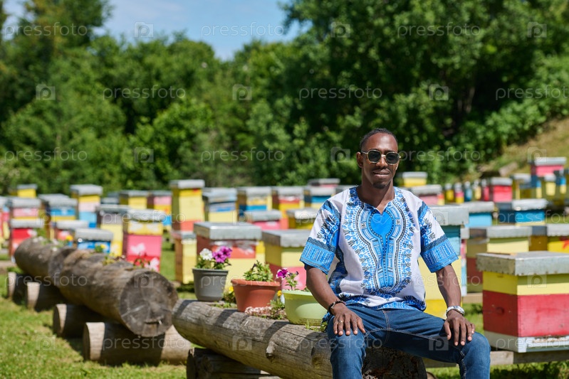 Афроамериканский подросток в традиционной суданской одежде изучает малый пчеловодческий бизнес среди природы