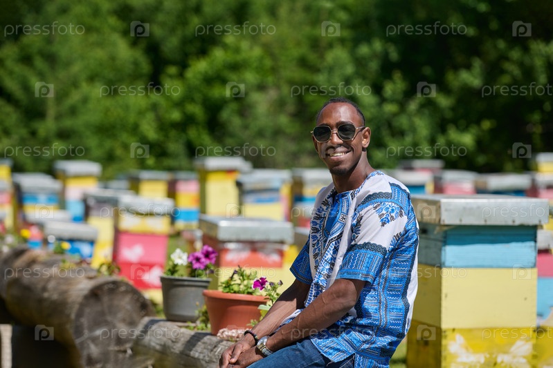 Афроамериканский подросток в традиционной суданской одежде изучает малый пчеловодческий бизнес среди природы