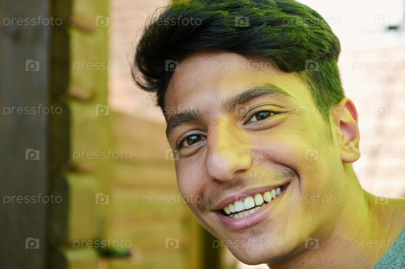 Ближневосточный мужчина с сияющей улыбкой и красивыми белыми зубами запечатлен крупным планом