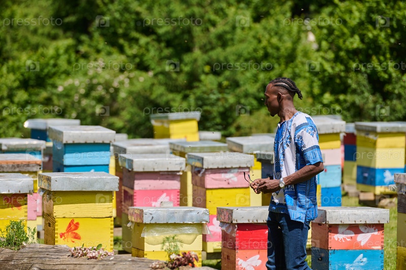 Афроамериканский подросток в традиционной суданской одежде изучает малый пчеловодческий бизнес среди природы