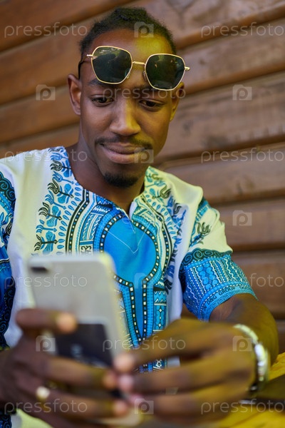 Афроамериканский подросток в традиционной суданской одежде пользуется смартфоном