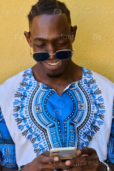 Афроамериканский подросток в традиционной суданской одежде пользуется смартфоном