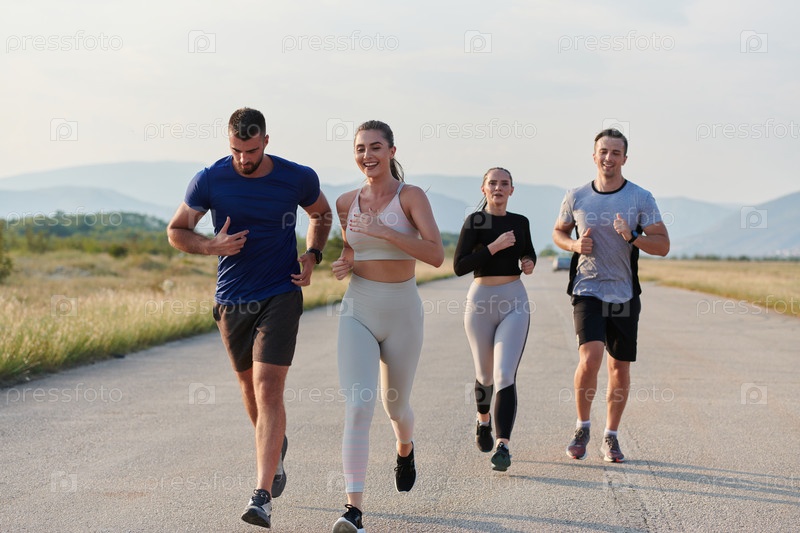 Группа друзей ведет здоровый образ жизни, бегая на свежем воздухе в солнечный день, занимаясь фитнесом и наслаждаясь бодрящим эффектом физических упражнений и природы